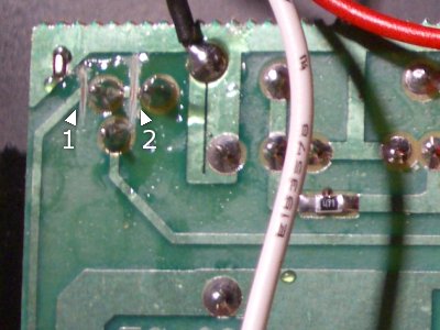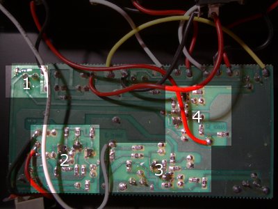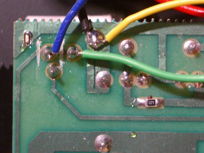 The first step is to cut the connection between the microphone pre-amplifier output and the third slider (1) and remove the short circuit between left and right channel (2): ![]() Next the old mono microphone jack ist removed from the case and the new stereo one is being mounted. See the picture below for information on how to wire it to the board, which is the final step: ![]() Yellow is being used for Ground (the contact closest to the outside of the case in the jack), green is being used for the right channel (in the middle of the jack) and blue for the left channel. That's it. A portable mp3, cd or whatever player can now be hooked up to the front jack. |