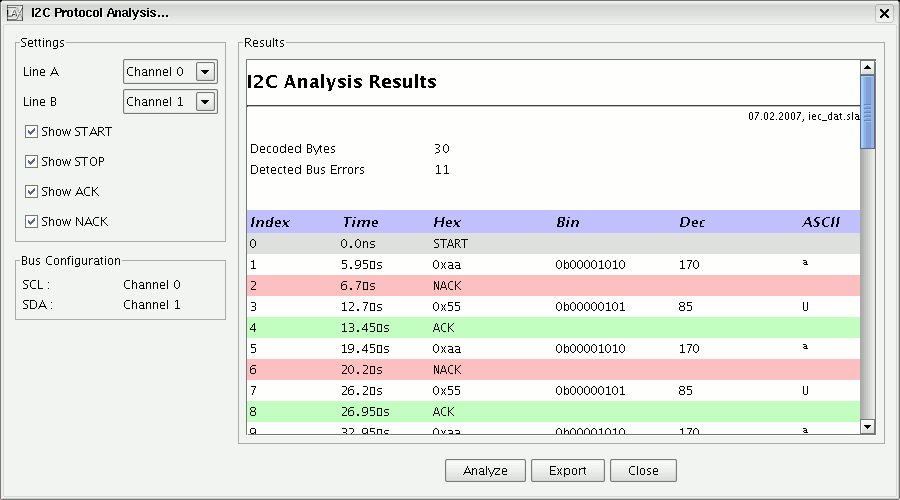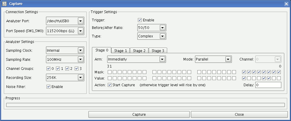 All settings of the physical logic analyzer can be controlled with the capture dialog: